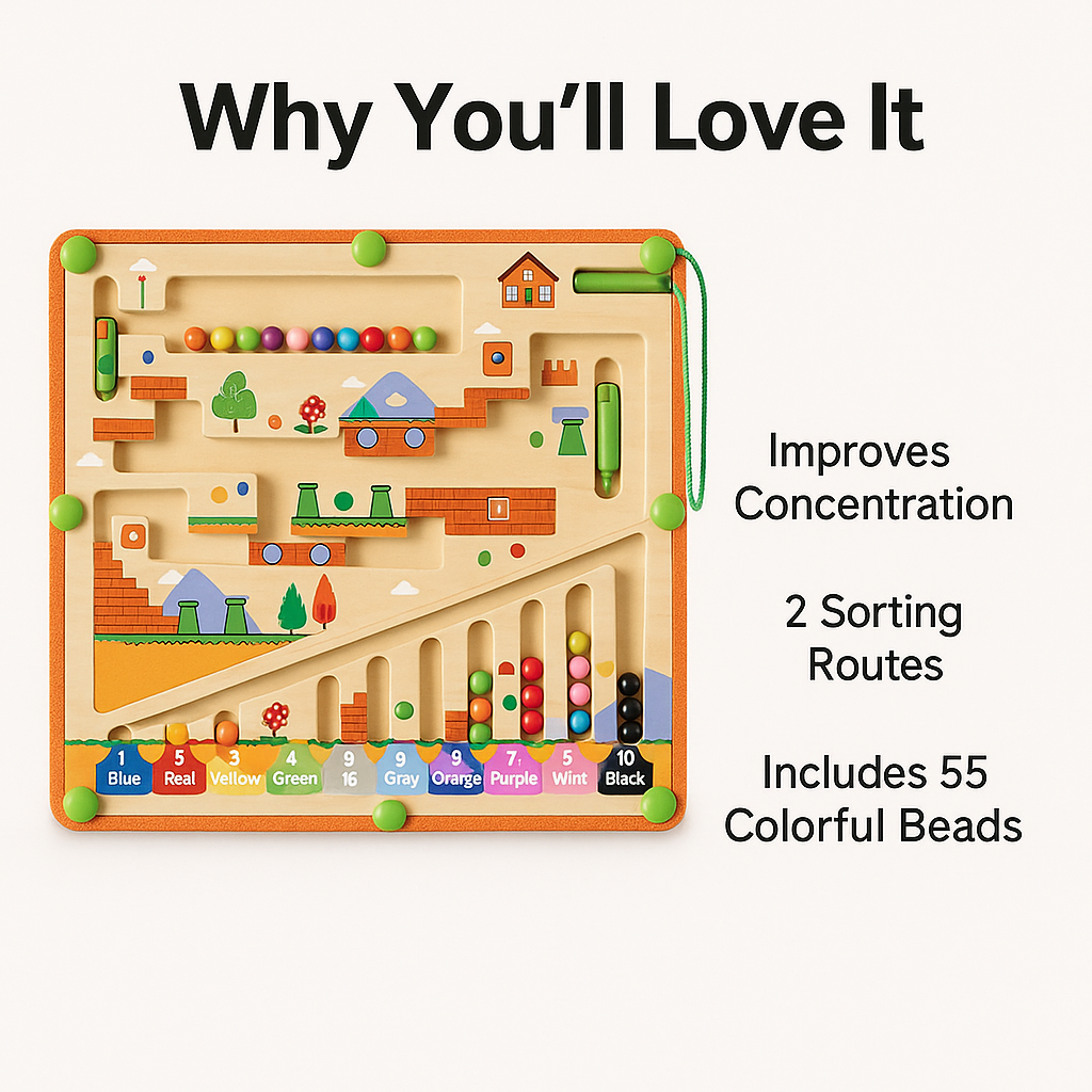Designed with Montessori principles and crafted from durable, child-safe wood, the Mind Genie Maze Board Game engages kids in screen-free play that strengthens concentration, hand-eye coordination, and problem-solving skills.
